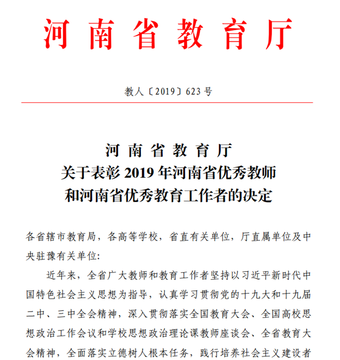 近日,从河南省教育厅印发的《关于表彰2019年河南省优秀教师和河南省优秀教育工作者的决定》(豫人[2019]623号)中获悉,我部范文婷老师荣获2019年“河南省优秀教师”荣誉称号。