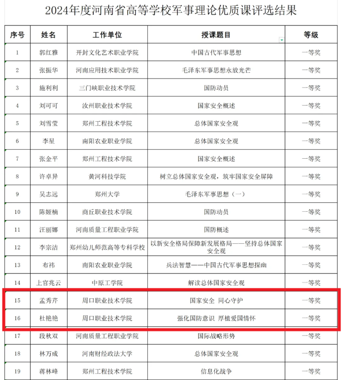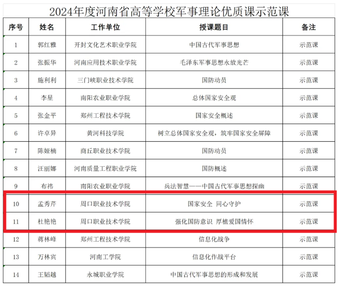 12月13日,河南省教育厅、河南省军区战备建设局关于2024年度全省高等学校军事理论优质课评选活动比赛结果公示。pp电子官方网站入口孟秀芹、杜艳艳两位老师分别荣获全省军事理论优质课比赛一等奖。同时,两位老师申报的课程入选2024年度河南省高等学校军事理论14门优质课示范课。