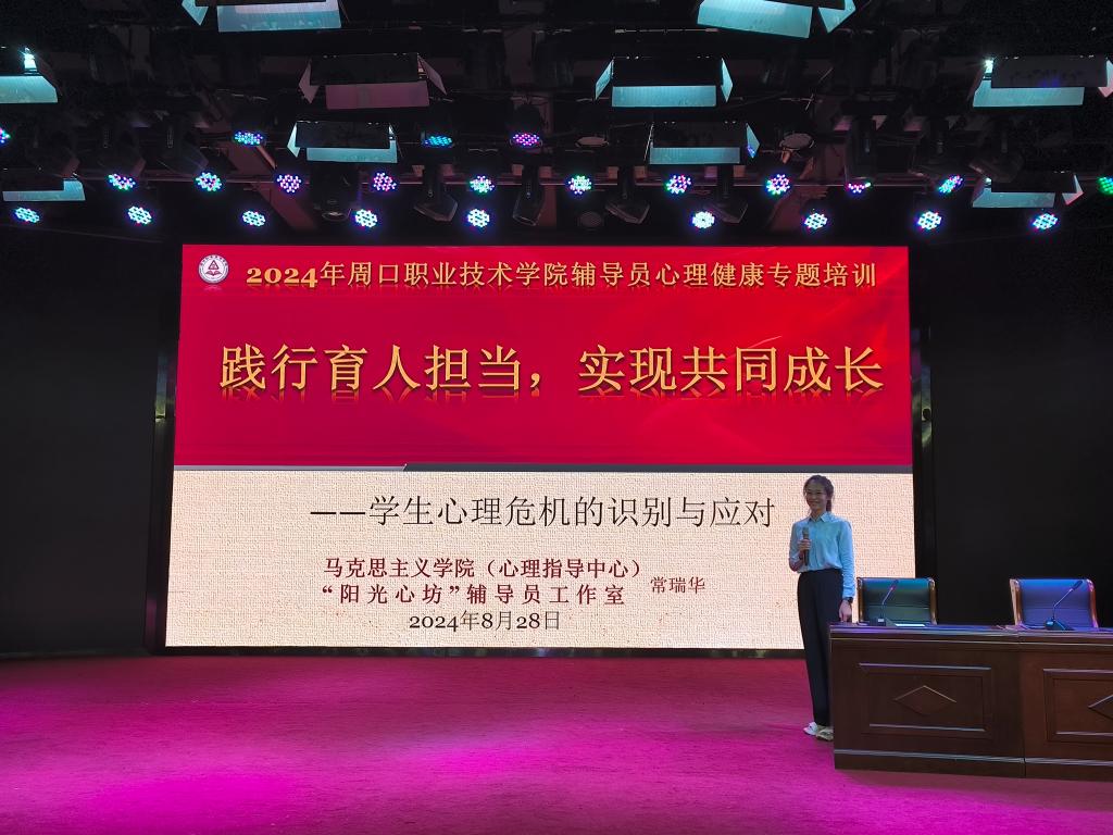为了提升辅导员在学生心理健康教育和危机干预方面的能力,学生处今日在学艺演播厅举办了一场主题为“践行育人担当,实现共同成长——学生心理危机的识别与应对”的培训活动。培训由学生处主办,心理指导中心主任、阳光心坊辅导员工作室主持人常瑞华担任主讲,全校辅导员积极参与,共同探讨如何更好地识别和应对学生心理危机。