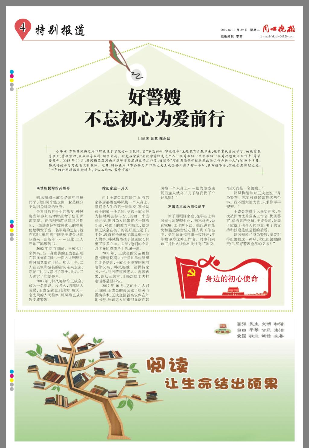 核心阅读:韩凤梅有着多个“身份”——警嫂、教师、党员,但她最在意的还是“中国共产党党员”这个响亮的身份。今年41岁的韩凤梅是周口职业技术学院一名教师。“不忘初心、牢记使命”主题教育活动开展以来,韩凤梅积极参与学习,热爱党的教育事业,爱岗敬业、为人师表、勇挑重担,服从领导安排,始终顾全大局。所在的党支部2018年被评为市直机关先进基层党组织。多次荣获全校学雷锋先进个人、优秀教师、文明教师、优秀思想政治工作者等荣誉称号。2015年10月获得河南省高等学校思想政治工作奖,被授予“河南省高等学校思想政治工作先进个人”荣誉称号;2019年5月被评为河南省文明教师。一周前,在周口市公安局工作的丈夫王成金要外出工作一年,她虽然万般不舍,但依然含着眼泪安慰丈夫:“一年的时间转眼就过去了,安心工作吧,家中有我!”