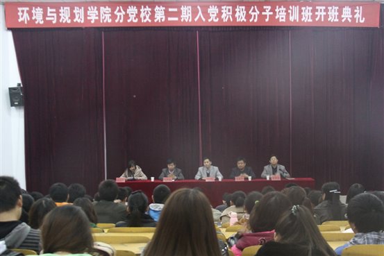 11月6日下午,环境与规划学院分党校第二期入党积极分子培训班开班典礼在文化路校区大学生文工团举行。校团委书记、学生工作部副部长曾凯,环境与规划学院党总支书记王东平、院长史本林、党总支副书记郑颖贞出席开班典礼,环境与规划学院全体学生党员、预备党员和30名入党积极分子参加了此次典礼。