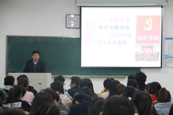 首先,王书记对十九大党章的主要内容进行介绍,并从确定了习近平新时代中国特色社会主义思想的历史地位、完善了中国特色社会主义的内容、充实了初级阶段的理论、修改了关于党的基础路线的描述、增写了十八大以来治国理政新经验、充实了党建设的内容六个方面详细解读了十九大新修订党章与十八大修订后党章的不同。随后,他讲解了合格党员应具备的标准,着重强调了要树立四种意识,严守党纪国法、坚持党的宗旨、保持清正廉洁、敢于善于担当作为。最后,王书记表示,希望在座的学生都能肩负起新时代的责任,深入学习十九大精神,深入学习党章,做一名合格的共产党员。