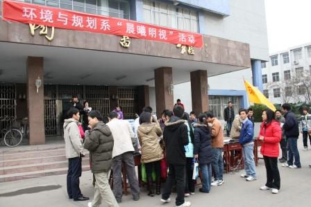 为迎接第23个国际志愿人员日,12月4日,环境与规划系团总支、学生会联合晨曦地理协会在文化路校区图书馆门前举行“晨曦明视”爱眼护眼大型公益爱心活动。该系党总支副书记贾永,团总支书记李琳莅临现场指导活动。