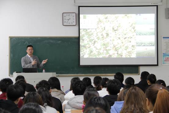 首先,邓书斌介绍遥感图像对于保险理赔的便利、运用卫星对地观测“星座”、遥感图像的种类及应用,并对比商业卫星、国产卫星、公益卫星来说明遥感图像的多样化和多元化。紧接着,他详细的向大家展示了通用遥感软件技术体系,并以遥感技术辅助城市建设生态规划、小麦种植区域遥感调查等的流程为例,使同学们在深入地认识到遥感软件技术体系的同时了解到不同类型的遥感图像处理方法。随后,他讲述了遥感中的深度学习并进行了遥感监测的应用演示。最后,他向同学们指出学习的“三驾马车”:理论知识、遥感软件、行业知识,并鼓励同学们敢于实践,勇于参加Esri校园开发竞赛。
