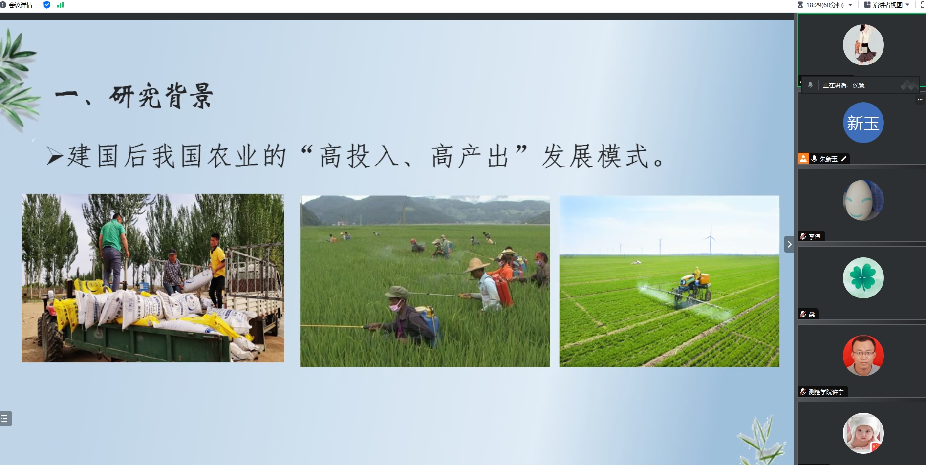 侯颖博士介绍了正在开展的有关有机肥与微生物菌肥配施对农田土壤和农作物产量影响的实验进展情况,并对后续样品采集、测试工作和成果撰写做了安排。梁春玲博士分享了有关智慧乡村规划方面的研究进展,介绍了目前正在开展的黄河故道区域乡村规划设计方面的工作进展。张志国博士分享了利用遥感手段研究城市热岛效应方面的工作。与会老师对自己感兴趣的问题与三位报告人进行了交流。