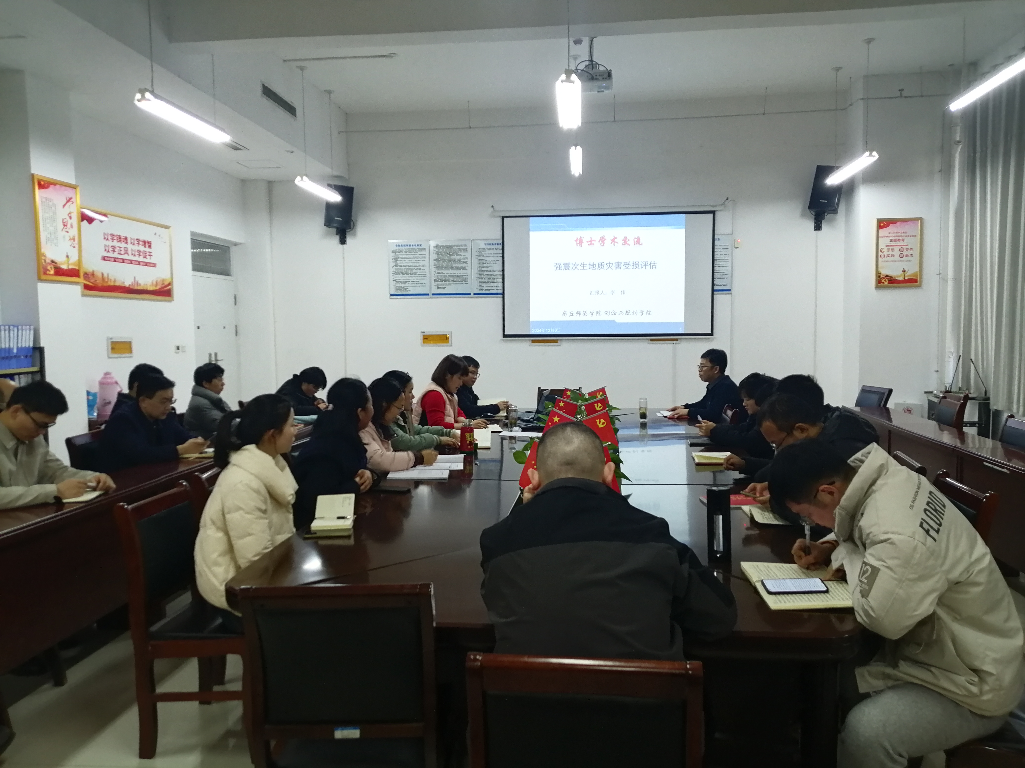 李伟博士汇报了近期有关强震次生地质灾害受损评估工作进展及接下来的工作安排。张志国博士汇报了无人机遥感在水体识别与地温测量方面的研究进展,并根据专业特征分享了无人机遥感领域未来研究方向。梁春玲博士汇报了《人居环境规划设计》专著的撰写进程及存在的问题。与会老师就自己感兴趣的问题与三位博士进行了交流。