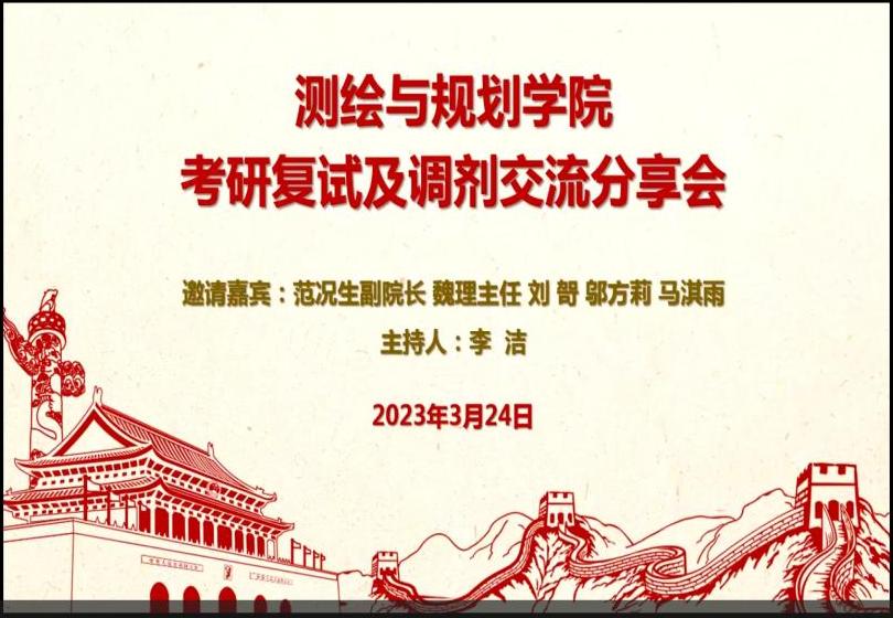 为帮助2023届考研考生更好地应对研究生复试及调剂问题,开云kaiyun官方网站于3月24日举行2023届考研复试及调剂经验分享会在线会议。本次会议由李洁老师主持,参与学生114人,邀请嘉宾为副院长范况生、学工办主任魏理以及2022届上岸的三位优秀校友:测绘工程专业刘哿,地理信息科学专业邬方莉和城乡规划专业马淇雨。