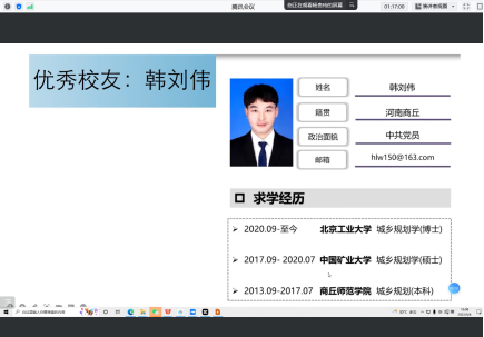 本次活动邀请到了一位优秀校友——北京工业大学韩刘伟博士,韩刘伟博士用视频的形式给新生学弟学妹们分享了“城乡规划专业是什么?学什么?怎样学?”等内容,同时还讲述了自己从本科-硕士-博士一路求学的心路历程,最后分享了他在学习、科研、学术会议等方面的心得。