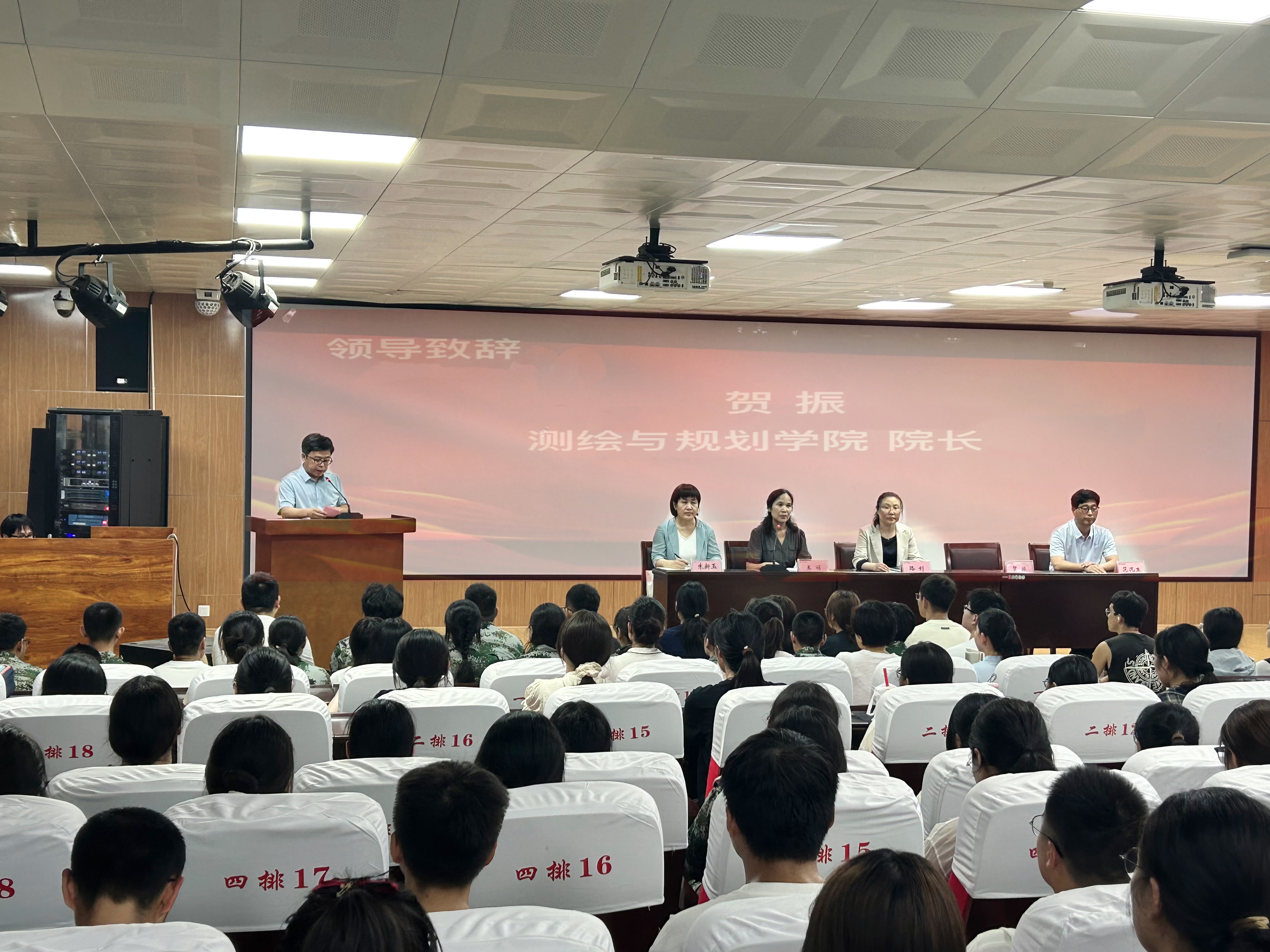 典礼在庄严的国歌声中拉开序幕。首先,贺振致辞,他代表全院师生向2024级新同学的到来表示热烈欢迎,同时寄语新生们珍惜大学时光,努力学习,全面发展,为实现自己的梦想打下坚实的基础。教师代表袁月分享了自己在教学科研中的感悟,鼓励新生们积极面对未来的挑战,勇于探索未知领域。随后,2013级校友韩刘伟博士用自己的求学经历激励了在场的每一位新生,为新生们树立了良好的榜样。新生代表杨丰荧表达了对大学生活的期待与憧憬。