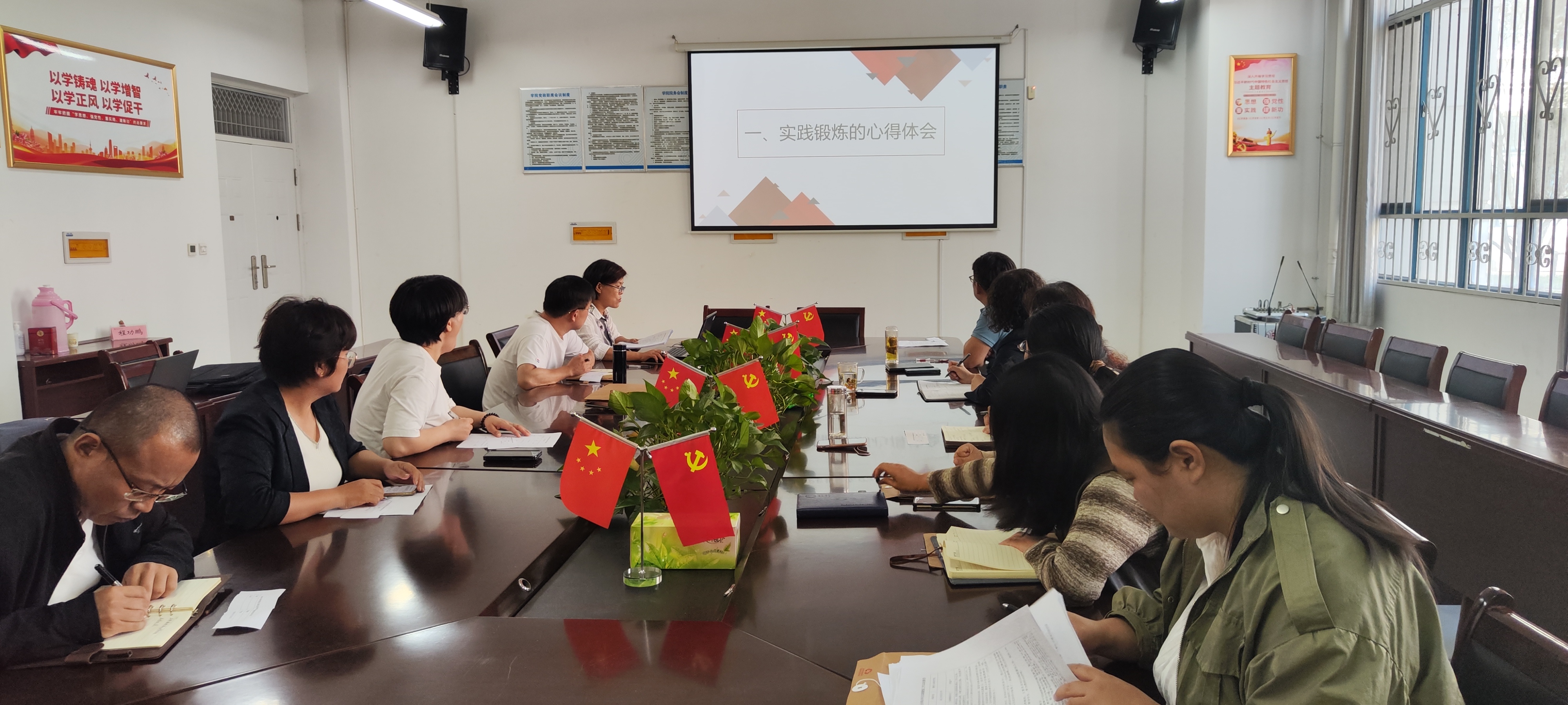 贺振院长首先介绍了学院考核的流程和注意事项。接着张梅、孔云霄、娄喜艳、李佳秀等四位老师先后通过PPT汇报了实践锻炼期间工作和任务完成情况。随后考核组成员认真审阅了四位教师提交的考勤记录、工作记录、实践教学案例、调研报告等材料。在此基础上,考核组对每一位教师作出综合评价。