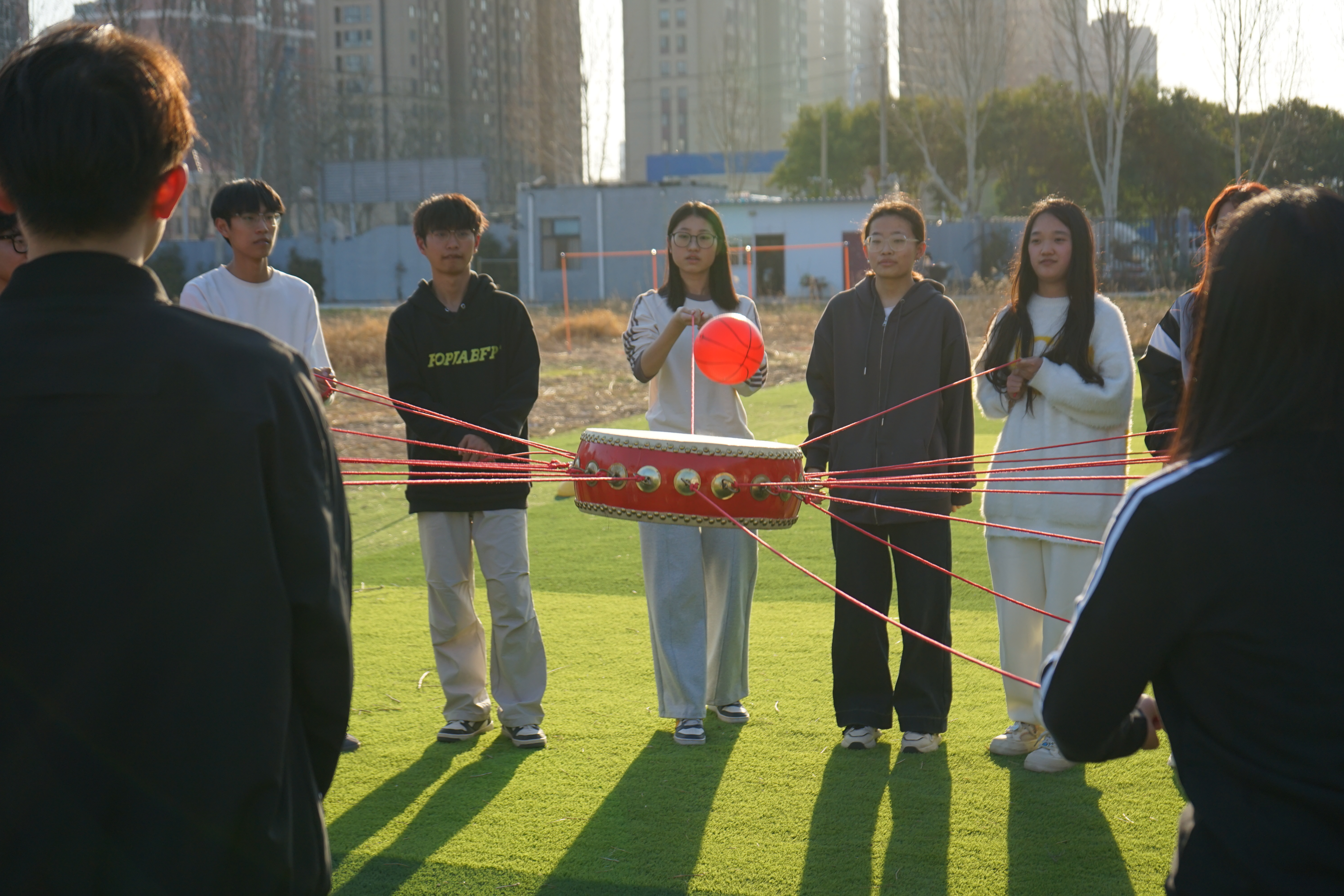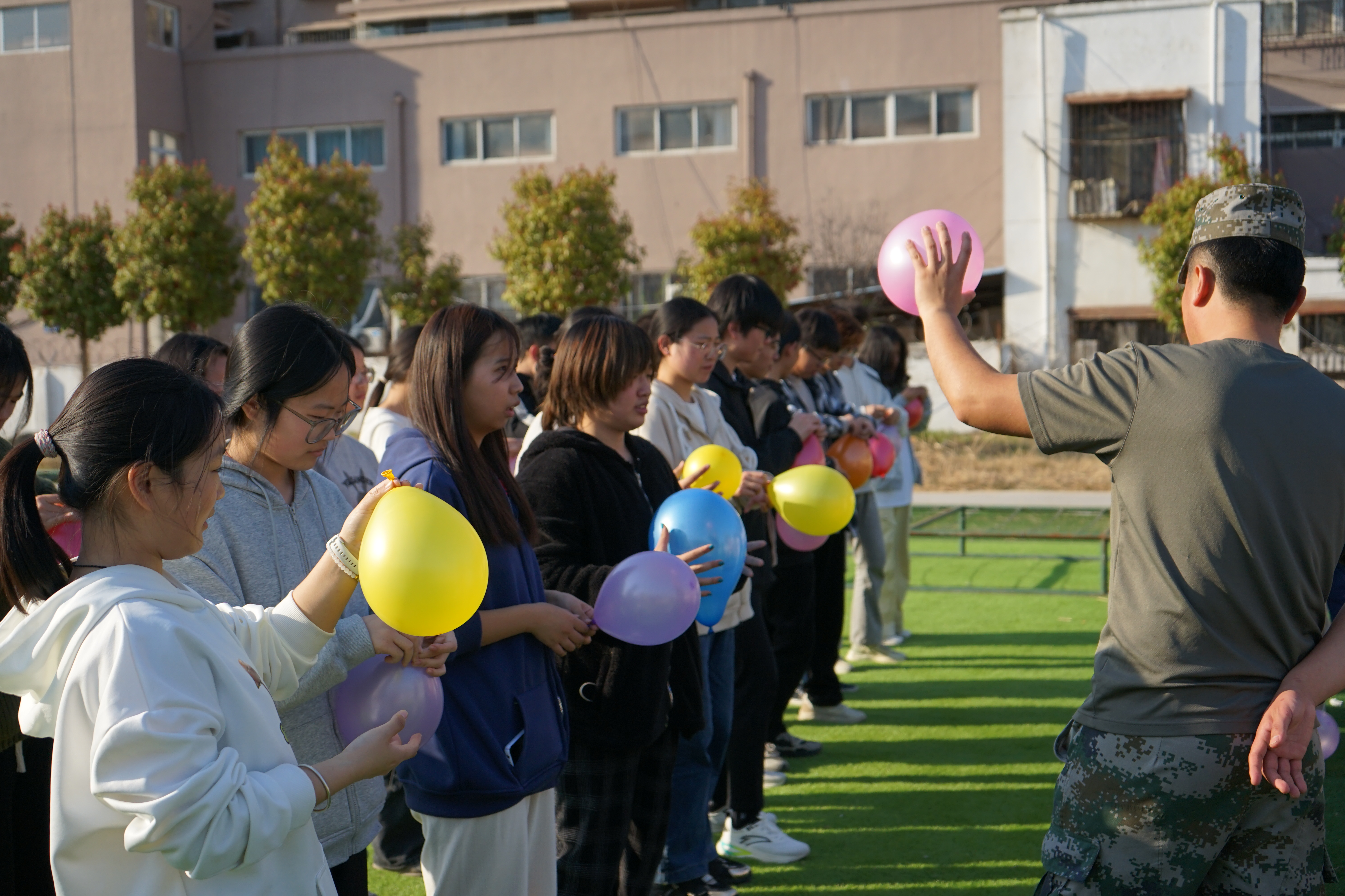 活动伊始,拓展训练师巧妙地运用一系列破冰游戏,迅速拉近了同学们之间的距离。随后,驻地官兵为大家进行了战术装备讲解,通过仿真枪械分解演示、战术手语教学等互动体验,强化了同学们的国防安全意识。紧接着,拓展训练师组织大家参与了“同心击鼓”和“气球大运输”两项趣味心理游戏。在“同心击鼓”游戏中,团队成员需默契配合,共同操控鼓面颠球,考验了团队协作能力;而在“气球大运输”游戏中,学生们需在限定时间内,通过团队合作完成气球运输任务。活动现场气氛高涨,欢声笑语此起彼伏。