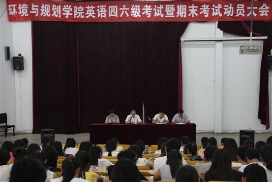6月12日下午,环境与规划学院英语四六级暨期末考试动员会在文化路校区大学生文工团召开。会议由开云官网党总支副书记郑颖贞主持,团总支书记李琳、辅导员魏理、赵强及13、14级全体同学参加了动员会。