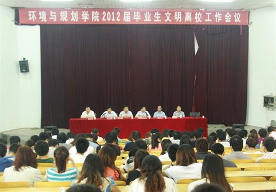 为确保2012届毕业生安全、文明、有序离校,6月2日上午,环境与规划学院在文化路校区大学生文工团召开2012届毕业生文明离校工作会议。学院全体领导班子成员,学院全体教师及143名2012届毕业生参加了会议。会议由院党总支副书记郑颖贞主持。