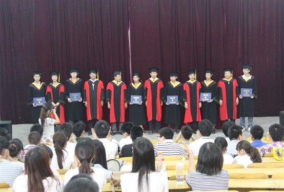 环境与规划学院全体领导班子分别为获得学士学位的毕业生拨流苏、正衣冠,颁发学士学位证,并与他们合影留念。