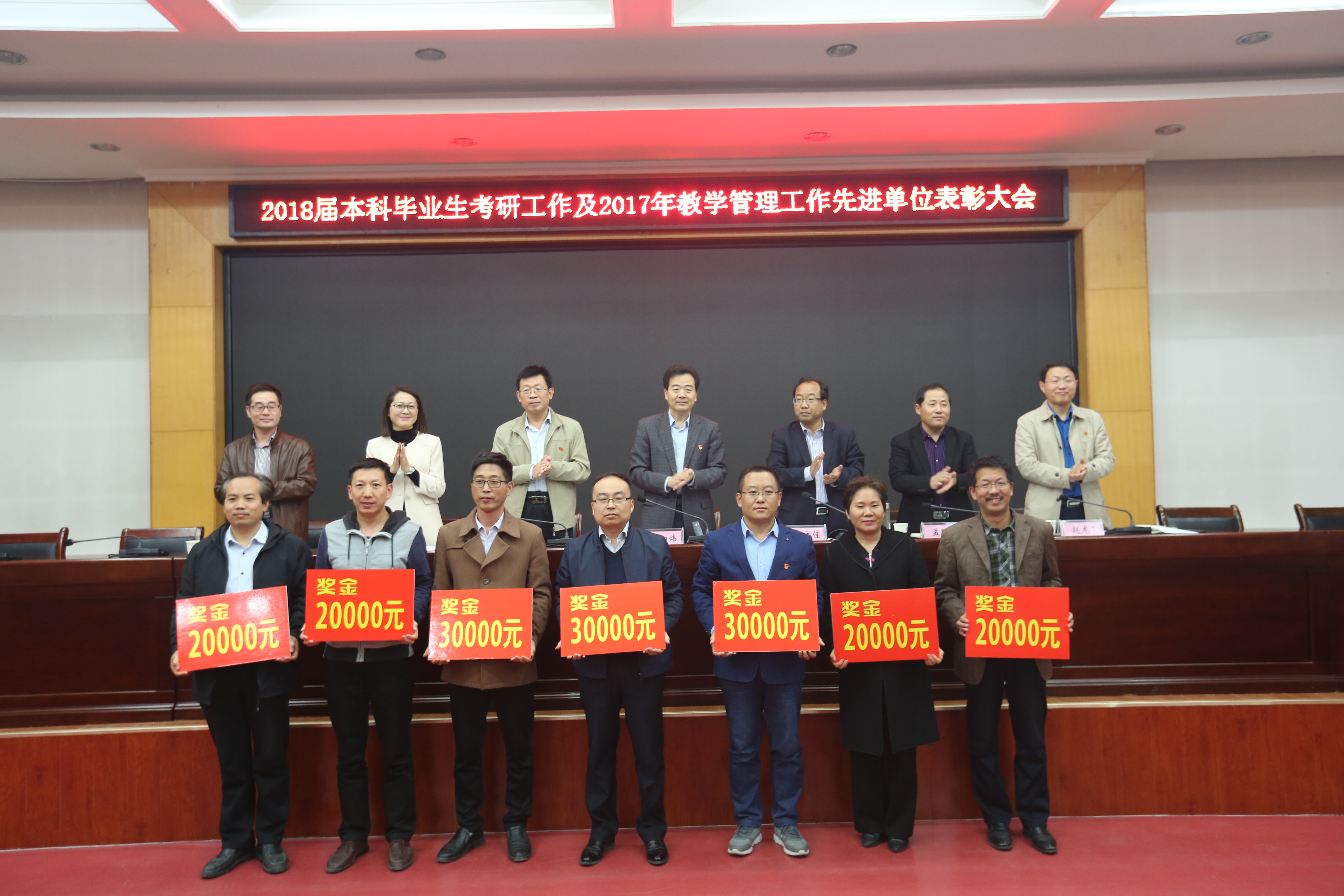 10月26日下午,开云官网在平原路校区召开了2018届本科考研工作表彰大会。副校长陈向炜、郭文佳出席会议,教务处、学生处、招生与就业处、校团委、教学评价与教师发展中心等部门负责人及各学院院长、副书记、教学副院长、教学办主任、考研辅导教师代表、大四(2019届毕业生)辅导员、大四学生代表参加了此次会议。会议由郭文佳副校长主持。会上, 招生与就业处处长庞永祥宣读了《商丘师范学院关于2018年考研工作先进单位表彰的决定》。副校长陈向炜、郭文佳及与会领导向获奖单位颁发了奖金和奖牌。