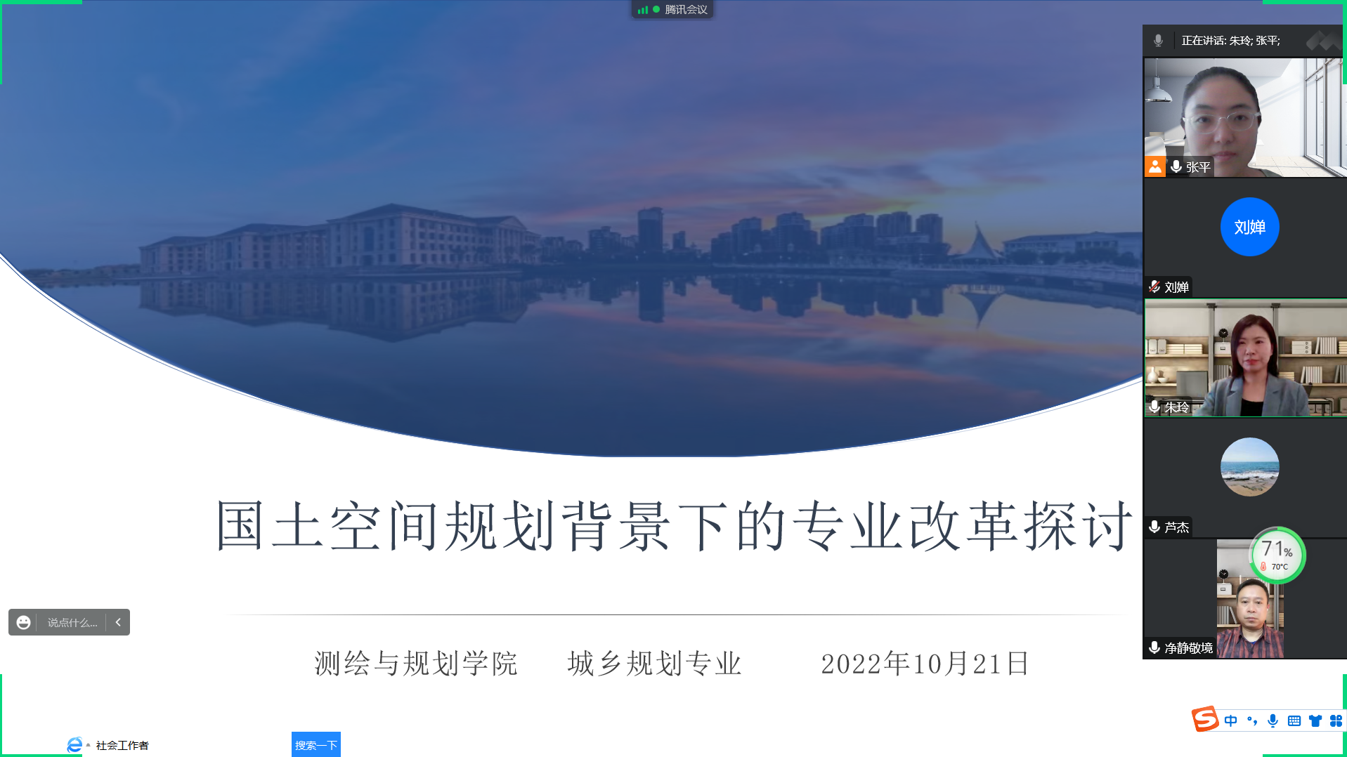2022年10月21日下午两点半,开云kaiyun官方网站城乡规划教研室组织开展了“国土空间规划背景下的专业改革探讨”主题教研活动,该会议因为疫情原因采用腾讯会议线上进行,本次会议由张平老师主持,城乡规划专业全体教师参加。