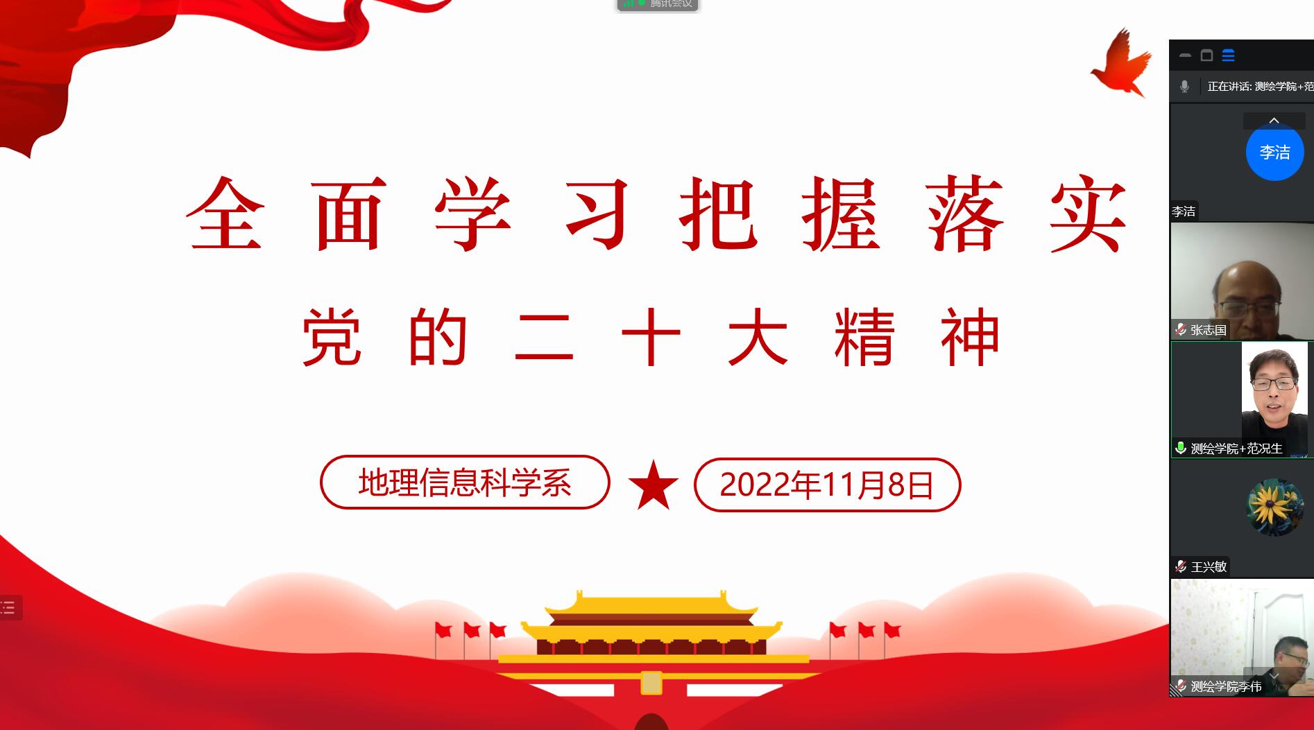 2022年11月8日晚上,开云kaiyun官方网站地理信息科学系通过腾讯会议开展全面学习把握落实党的二十大精神教研活动,地理信息科学系全体教师参加。