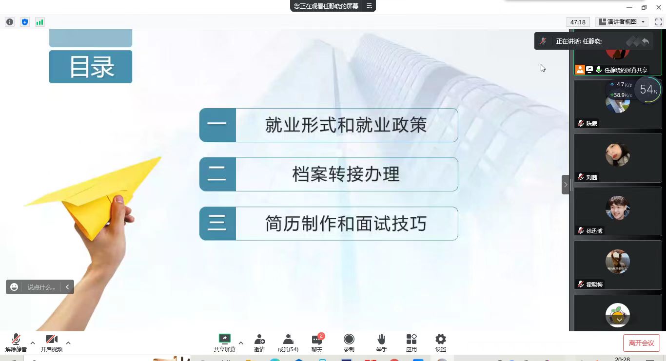宣讲会上,任静晓首先从毕业生规模、社会需求以及就业结构等方面分析了当前大学毕业生的就业形势,使毕业生充分了解目前的就业形势,掌握就业动态;接着,结合2023届高校毕业生就业工作相关文件讲述了就业政策主要内容,并对毕业生提出了几点要求:一是树立正确的就业观念,二是抢抓就业黄金期,三是做好求职简历、掌握面试技巧,积极进取,争取早就业、高质量就业;最后,就档案转接办理和毕业生协议签约等内容做了相关讲解,鼓励同学们在求职过程中遇到困难困惑多与老师同学交流。